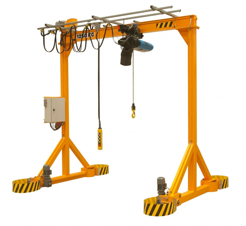 Устройство состоит из тали, балки пролетной, балок опорных, стоек, укосин, колес поворотных с тормозом, которые крепятся между собой стандартными крепежными изделиями.