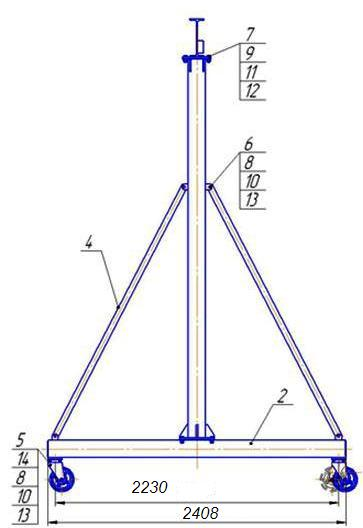 Устройство состоит из тали, балки пролетной, балок опорных, стоек, укосин, колес по